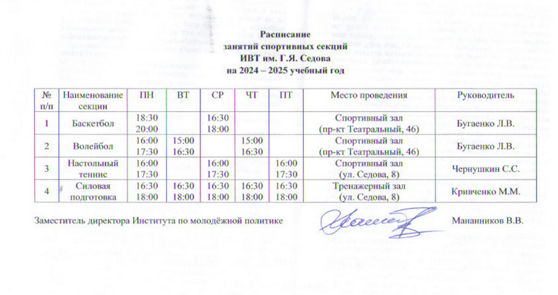 Расписание спортивных секций СК «Седовец»