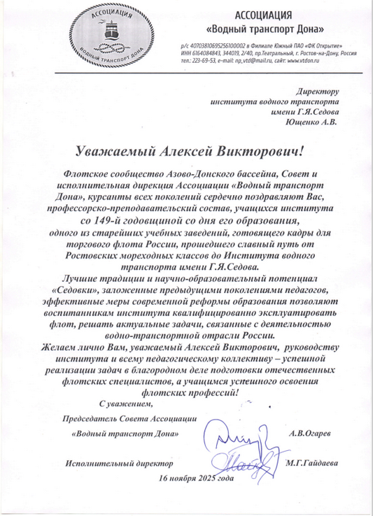 Позвольте сегодня в день 149–летия нашего Института выполнить поручение ректора и Ученого совета Государственного морского университета имени адмирала