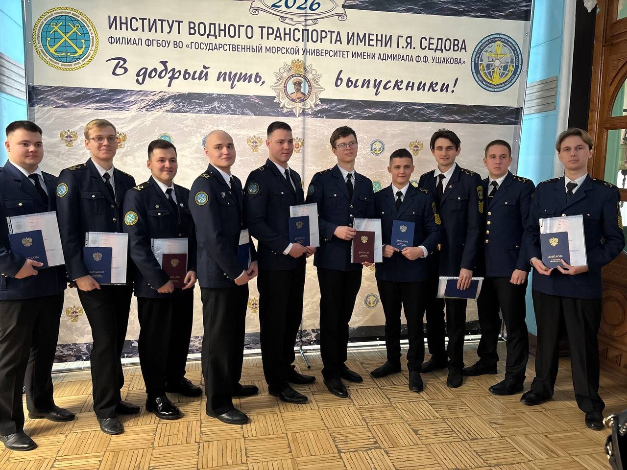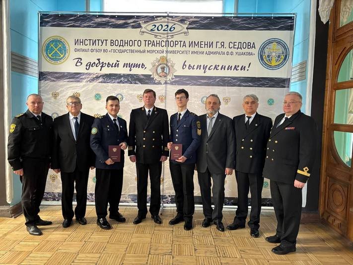 5 марта 2026 года в Институте водного транспорта имени Г.Я. Седова – филиале ФГБОУ ВО «ГМУ им. адм. Ф.Ф. Ушакова» состоялись торжественные мероприятия, на которых вручены дипломы выпускникам, завершившим обучение на Факультете инженеров морского транспорта и в Морском колледже Института.