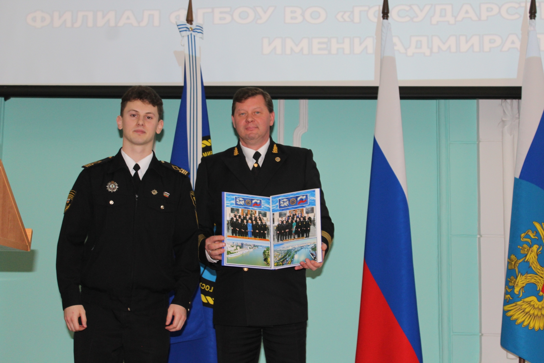 Председатель государственной экзаменационной комиссии по специальности «Судовождение», начальник Инспекции государственного контроля Службы капитана порта Федерального государственного бюджетного учреждения «Администрация морских портов Азовского моря» Сидоренков В.Г. вручил книгу «Штурман дальнего плавания» курсанту Вислогузову В.И., продемонстрировавшему самые высокие теоретические знания и практические навыки при сдаче государственного экзамена.