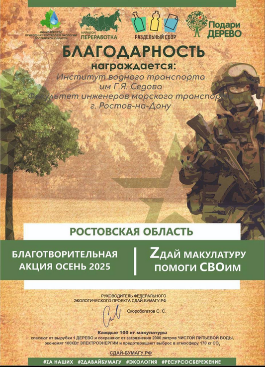 Факультет инженеров морского транспорта принял участие во Всероссийском Эко-марафоне ПЕРЕРАБОТКА 2025 под девизом: «Zдай бумагу – помоги СВОим», который проводится при поддержке Министерства природных (https://mpr26.ru/) ресурсов и охраны окружающей среды Ростовскойобласти (https://mpr26.ru/) и краудфандинг проекта «Подари Дерево» www.подари-дерево.рф