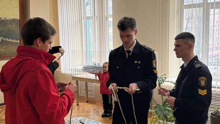 По завершении информационной части гости нашего мероприятия могли посетить экскурсии в сопровождении начальника МУТЦ Журавлева В.М. по современным учебным классам с демонстрацией мультимедийного тренажерного оборудования. Также курсантами в холле второго этажа были организованы мастер-классы по вязанию морских узлов.